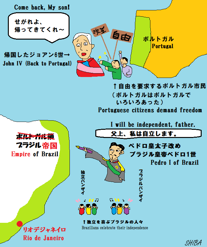 ナポレオンの倒れた後の1815年には国王(当時は女王マリア1世)のいる場所が植民地であってはならないということで、ブラジルは「ポルトガル本国の一部」(つまりポルトガルと同等の扱い)に格上げされます。しかし1820年にポルトガルで革命が起こると、ブラジルでポルトガル王となったジョアン6世も本国に帰るのですが、こうなるとまたブラジルが植民地に格下げされてしまうのではないか。そう思ったブラジルの人々は、帰国しなかった王子(ペドロ皇太子)を君主につけて、1822年独立を宣言しました。植民地に戻るくらいなら、もうポルトガルから独立してしまおうという(大胆な)発想です。