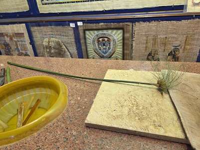 ナイル川を渡ってしばらく走ると、ギザに入り、次第に町からビルが消える。一般住宅の屋根の向こうを見ると、ついに待望の三角形が。ところがまだピラミッドはお預け。今度は政府が運営しているという入場無料のパピルス・ショップで降ろされた。古代エジプト人が紙として使用していたのがパピルスである。中では店員さんがカタコトの日本語でパピルスの作り方を教えてくれたが、案の定最後は「この作品、10ユーロでどう?」まあ当然のいきさつだと思ったが、断った。