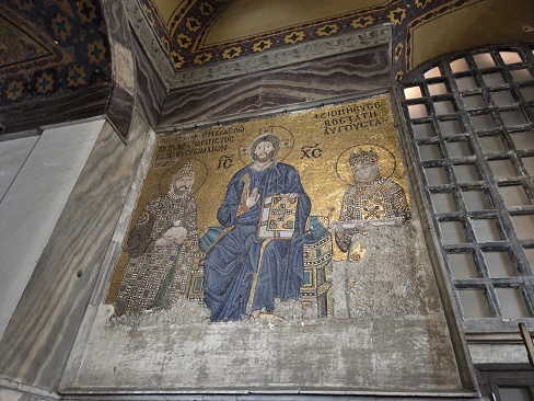 無事にアヤソフィア内へ入場。母は頭にスカーフを巻いての入場である。アヤソフィアの1階は実際に礼拝の場となっており、そこはイスラム教徒以外立入禁止なのだそうだ。その為、私達は入ってすぐのスロープを上り、いきなり2階へ。ビザンツ帝国(395~1453年)時代、キリスト教の大聖堂として建設されていたこの建物には、当然ながらイエスや聖母マリアのモザイク画が描かれていた。しかし15世紀にオスマン帝国がこの地を征服すると、大聖堂はモスクとなり、これらは漆喰で塗りつぶされてしまったらしい。オスマン帝国崩壊後の1930年代になって壁画が再発見され、現在は一部が再び私たちの前に姿を見せている。それ以降しばらくここは博物館となっていたが、現政権下のもと、2020年モスクの機能が復活したのだそう。壁画にはイエス、聖母マリア、洗礼者ヨハネのほか、アヤソフィアに深く関わったコンスタンティヌス大帝、ユスティニアヌス帝の姿もあり、私も興奮。いやそれ以上に、天井から壁、柱や照明ありとあらゆる場所に装飾がほどこされ、アヤソフィアの荘厳さに拍車をかけていた。これは世界中から観光客が訪れるのも納得である。
