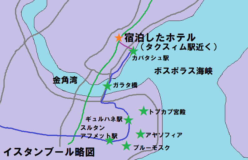 F1線は地下鉄というか、地下を走るケーブルカーで、駅も起点のタクスィムと終点のカバタシュの2駅だけだった。駅を降りると、そのまま今度はトラムT1線乗り場へ。路線を変えるごとに初乗り運賃がかかる。路面電車は海岸に沿って走り、ガラタ橋で金角湾を渡った。そこからいよいよイスタンブールで最も有名な地区に入る。路面電車は細い路地を縫うように走り、ギュルハネ駅へ。19世紀にタンズィマートが開始されたギュルハネ勅令で知られる地名である。私達はここから歩いて、まずアヤソフィアへ向かった。途中男性が日本語で話しかけてきたが、アヤソフィアへ行きたいと伝えると、親切に道を教えてくれた。