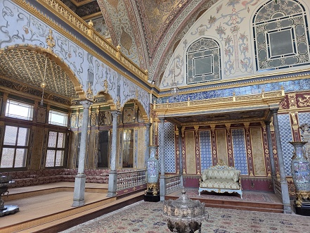 すっかり感動した私達は、続いてトプカプ宮殿へ赴く。こちらも予め申し込みをしており、指定されていた近くのお店で再度受付した上で、ホスト(ツアーガイド)に連れて行ってもらう形式だった。ホストのイケメンに連れられて宮殿へ向かう一行。年齢も性別も国籍もバラバラだが、ざっと30人はいるかな。ここでも荷物検査を受ける必要があり、そこから巨大な城門、そしてスルタンの居住地だったハーレムへ入る。ホストの案内はここまでで、そこからは自由に見学できるとのこと。このハーレムが広くて入り組んでいた。当時この建物を管理していた宦官の役人や奴隷の部屋が主であったが、スルタンの間まで来ると、うって変わって金やガラスに彩られた空間が広がっていた。壁の青タイルもトルコらしい。順路と言うものは無いので、あっちに行ったりこっちに行ったり、だいぶ歩いてしまったが、面白かった。