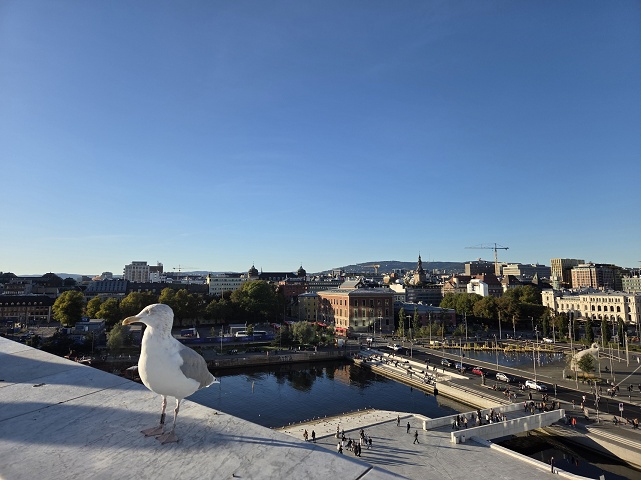 ペラハウスから見たオスロの街と、そこに現れた巨大カモメ?
