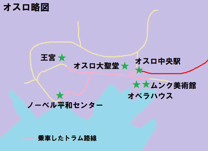 ここでようやく母からのLINEが来たので、急いで美術館へ戻る。ただ今度来たトラムはT15という、先ほどの駅を通らない列車だった。構わず乗り込み、分岐点で降りるはずが、なぜかその次のオスロ中央駅まで行ってしまった。仕方がないので、ここからダッシュで美術館へ向かい、息も絶え絶えながら母と合流。彼女は美術館を堪能できたらしいが、館内のWi-fi環境がイマイチで、メッセージを受信できなかったらしい。ムンクの絵画をプリントした絵はがきを何枚か購入し、帰路へ。と、途中レストランにノルウェー国旗が掲げられているのを発見。これで一応ノルマは達成できた。