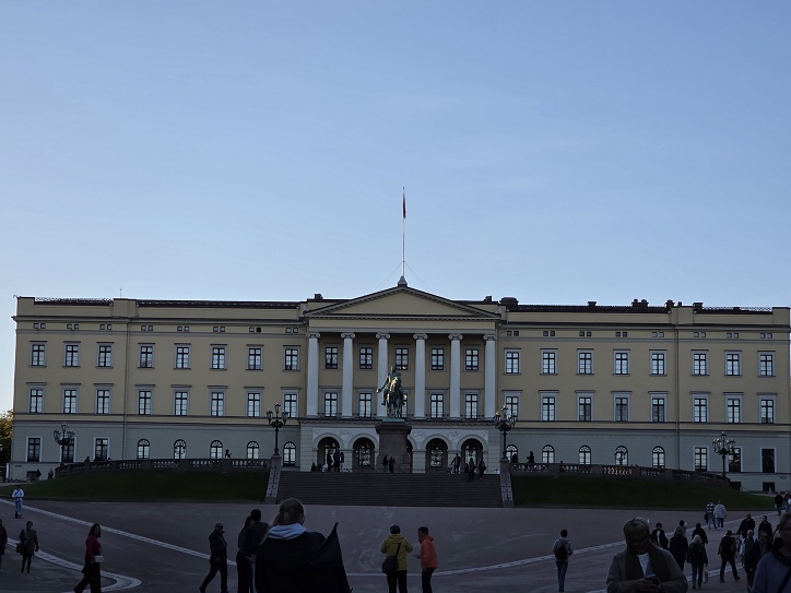 さすがは王室のお住まい、立派な建物であるが、中にまでは入らない。というのも、ここに来た最大の目的は、ノルウェーの国旗を撮ることにあった。実は今まで訪れたベトナムからデンマークまで、1枚は国旗を撮影し、その国を訪問した証拠として保存していた(サムネイルに使用している写真)のだが、どうもオスロ市内には国旗が見当たらなかった。そこで王宮など国の重要な場所なら、はためいているだろうと思ったのだが、そしてその読みは当たっており、王宮のてっぺんに国旗が掲げられていた、ように見えたのだが、残念ながらこの時のオスロでは風が弱く、国旗は柱にクタっともたれかかっていた。これではどこの国旗かまったく分からない。