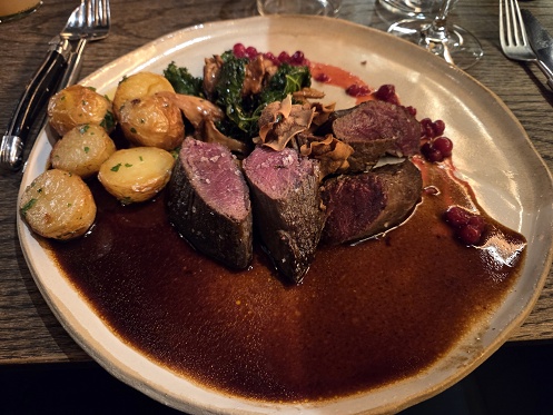 2つの名所を廻って、トゥナのご自宅にお邪魔する。家では旦那さんのヴィゴーが待っていてくれた。彼は建築家であり、この家のリフォームも自分で手掛けたそうだ。この家のウッドデッキからもミョーサ湖が見られたし、周囲には樹々がたくさん。住むには最高の環境だろう。室内には絵画がたくさん飾られていた。さすがはアーティストである。母とトゥナはここで、40年以上前の話に花を咲かせていた。夜は近くのレストランでご馳走してもらった。私はトナカイ肉のソテーに挑戦。若干硬めではあったが、おいしく完食できた。