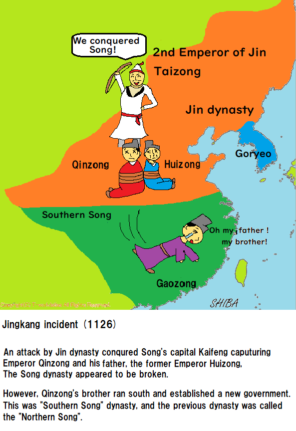 In the 12th century, “Jurchen(女真)” people in Manchuria had power and they built “Jin(金)” dynasty. Jin and Song defeated Liao and expelled Khitan west. However, soon a conflict arose between the Jin and the Song. In 1126, the Emperor of Song was captured by Jin. It was called “Jingkang incident(靖康之变)”. After that, the territory of the Song (南宋:Southern Song) was limited to the area south of the Yangtze River.