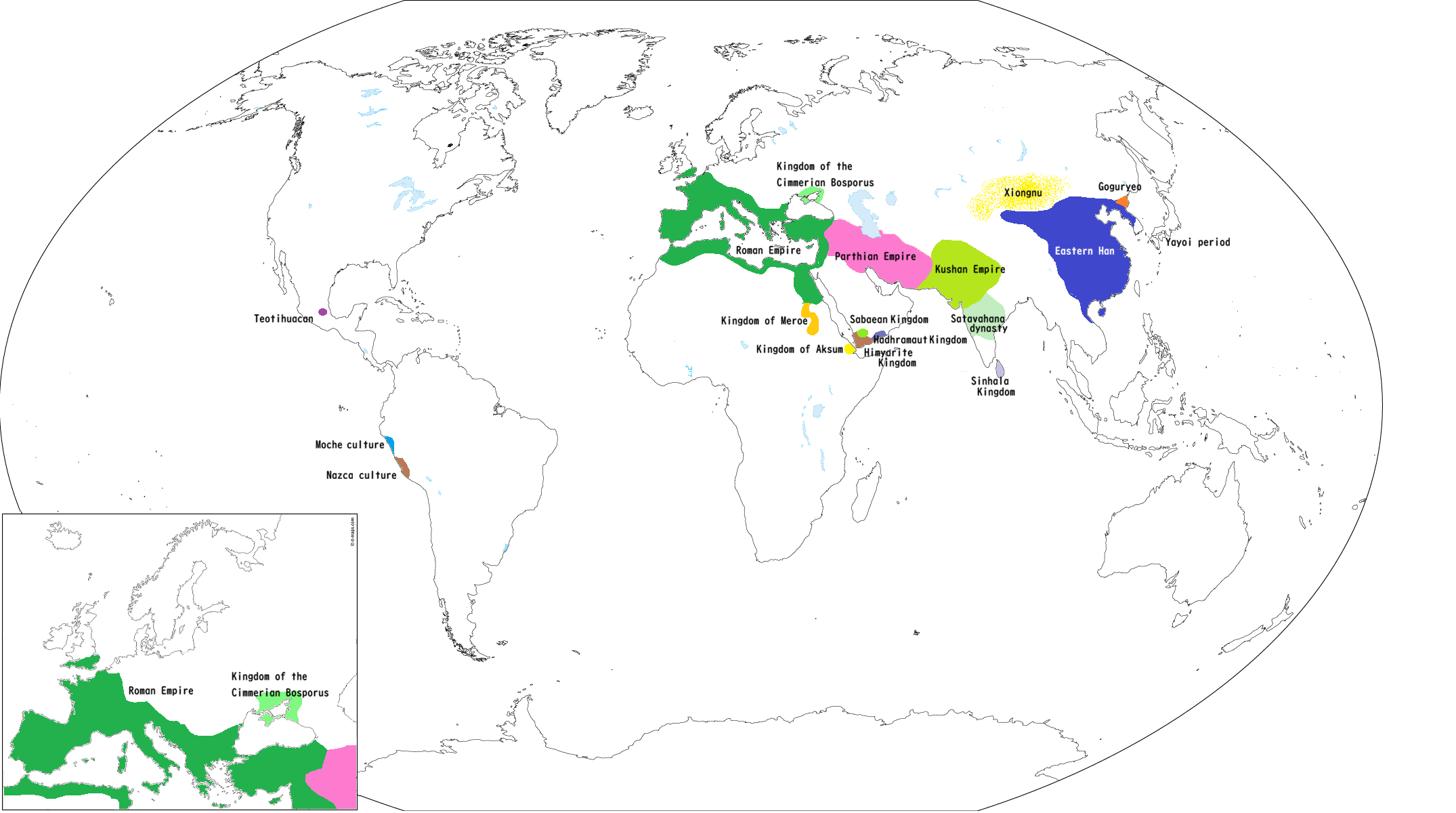 In eastern Eurasia, the Han(漢) dynasty was entering a new phase. A man named Wang Mang(王莽), who was related to the imperial family, usurped the dynasty and changed the country’s name to Xin(新). Wang Mang embarked on land reform to eliminate the disparity between rich and poor, but many people opposed it, and in the end a great rebellion (Red Eyebrow Rebellion) broke out and the reform ended in failure.