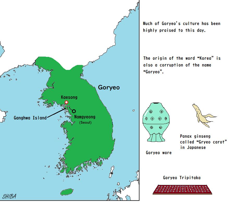 In the 7th century, Silla succeeded to unify the three kingdoms. The capital of Silla was located in Gyeongju (경주/慶州; famous for being the location of the World Heritage Site Bulguksa Temple), and Hanseong was renamed “Hanyang(한양/漢陽)” around this time.  The man who defeated Silla in the 10th century was Wang Geon(왕건/王建), and with the meaning of rebuilding “Goguryeo(고구려/高句麗)”, he built a country called “Goryeo(고려/高麗)”.  The capital of Goryeo was located in Kaesong (개성/開城;the second largest city in North Korea at present), but Hanyang also played an important role as the viceroyal capital. Therefore, the city was also called “Namgyeong(남경/南京;means southern capital)” during the Goryeo period.  In the 13th century Goryeo was attacked by the Mongol Empire, but the royal family resisted by fleeing to Ganghwa Island(강화도/江華島) off the coast of Kaesong for several years before surrendering.