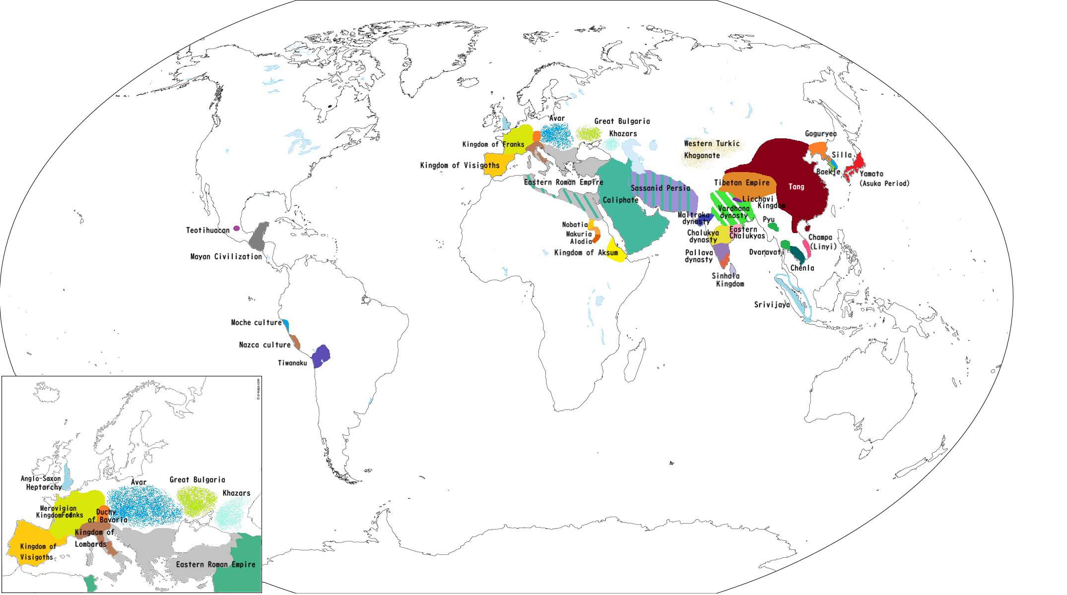 In West Asia, the Byzantine Empire dominated the western region while the Sasanian Persian Empire controlled the eastern side. These two powers repeatedly clashed in wars over supremacy. By the early 7th century, both empires had become exhausted, creating a power vacuum in West Asia. It was around this time, in the religious city of Mecca on the Arabian Peninsula, a merchant named Muhammad had received “divine revelations” and founded Islam, approximately in 610.